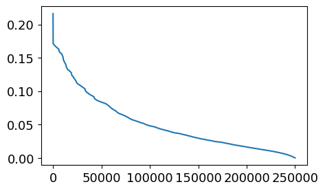 1 2 plt.figure(figsize=(5 , 3 )) _ = plt.plot(sorted (mean_diff_created_time.values, reverse=True ))