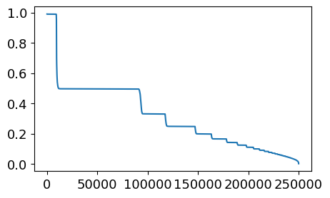 1 2 plt.figure(figsize=(5 , 3 )) _ = plt.plot(sorted (mean_diff_click_time.values, reverse=True ))